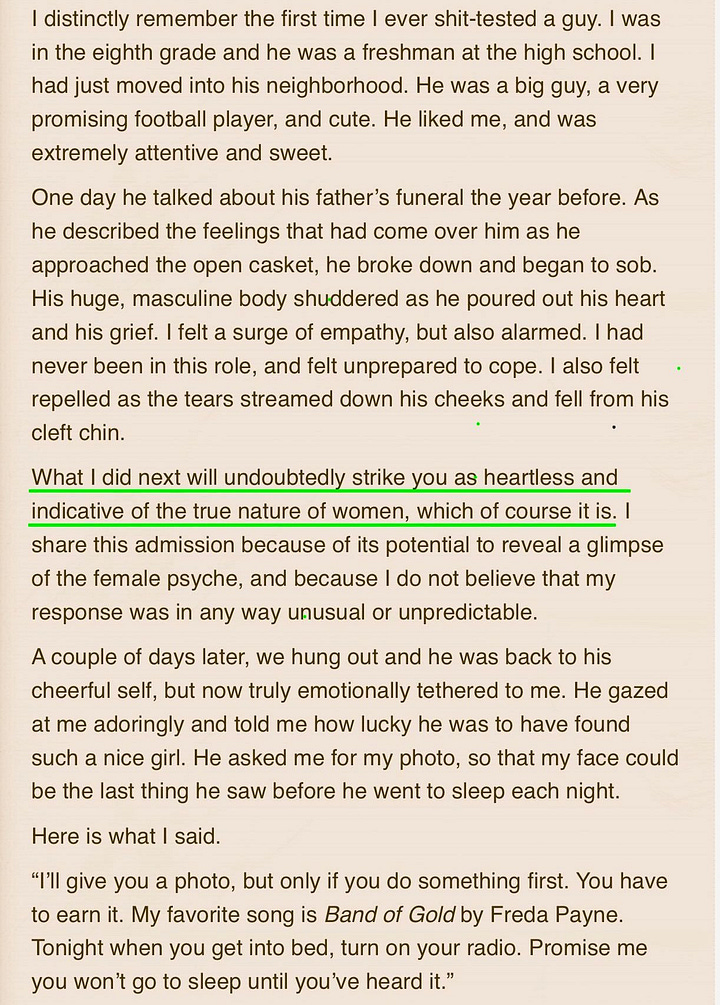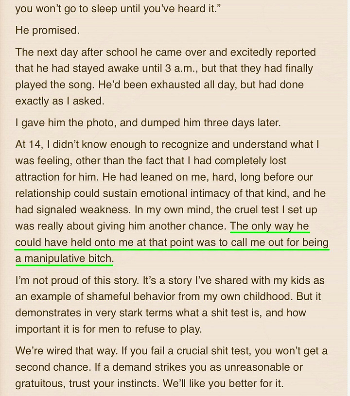 While there might be a streak of teenage cruelty therein, the consensus from internet psychologists is that this test contains an element of wisdom. She intuited weakness, but wanted strength. So she came up with a plan to test her boyfriend. A shit test. He did not pass. As the author herself states: “The only way he could have held on to me at that point was to call me out for being a manipulative bitch.”